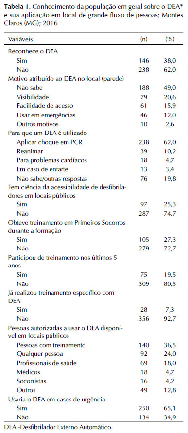 RESULTADOS: Participaram do estudo 384 pessoas, sendo que a maioria da população entrevistada não conseguiu identificar o DEA (62%), porém foi capaz de descrever a sua função. Apenas 19,5% dos entrevistados realizaram treinamentos de primeiros socorros nos últimos 5 anos e,uma parcela menos ainda (7,3%), realizou treinamentos específicos com o DEA.
