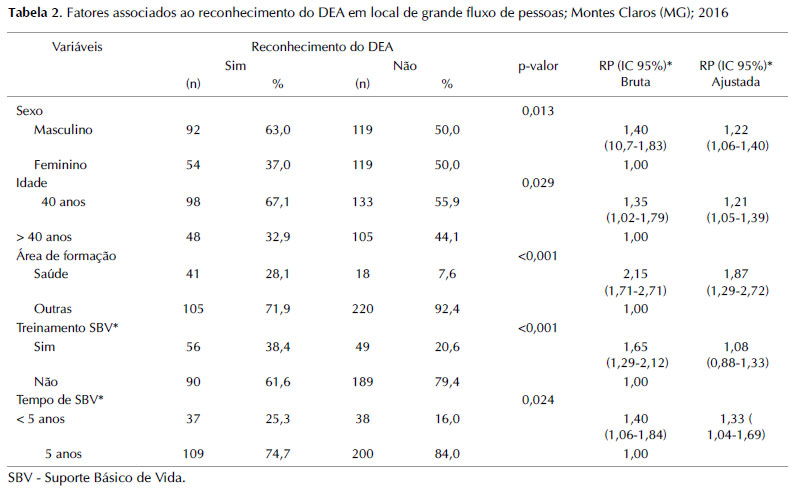 A tabela 2 apresenta os resultados das análises de associação entre características dos entrevistados e a habilidade de reconhecimento do DEA, com Razões de Prevalência brutas e ajustadas (após análise de regressão de Poisson). As variáveis que se mostraram associadas foram: sexo masculino, idade igual ou inferior a 40 anos, formação na área da saúde e participação em cursos de SBV há menos de cinco anos.