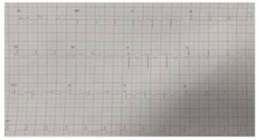 Paciente idoso internado por SRAG por COVID-19 apresenta piora súbita da dispneia referida na admissão e hipoxemia persistente. Foi aumentado oxigenoterapia suplementar, solicitada nova tomografia de tórax para elucidação diagnóstica e eletrocardiograma. ECG mostrou uma FC de aproximadamente 75bpm, ritmo regular e sinusal, eixo normal, sem alterações de intervalo PR ou QRS. Presença de ondas T negativas em parede anterior e inferior. Sem anormalidades de onda P, sem supra ou infradesnivelamento de ST (Figura 1). Ao se calcular os escore de Wells obteve-se um valor de zero. Devido às alterações eletrocardiográficas e piora da dispneia e hipoxemia paciente foi levado para uma angiotomografia de tórax que evidenciou tromboembolismo pulmonar bilateral.