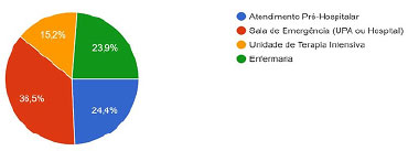Quanto ao local de trabalho, 36,5% atuam em salas de emergência de Unidades de Pronto Atendimento (UPA) ou hospitais, 29,4% no atendimento pré-hospitalar, enquanto que na enfermaria e unidade de terapia intensiva, respectivamente 23,9% e 15,2% (figura 1).