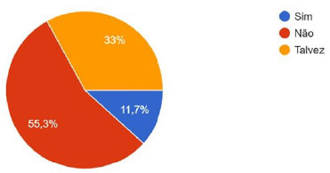 Quando se avalia a percepção dos profissionais de saúde em relação a capacidade de suas unidades de trabalho possuírem condições de responder frente a um cenário de maior contingência, 55,3% acreditam que não estão preparadas, outros 33% acreditam que “sim”, estão preparadas, enquanto 11,7% optaram pela incerteza respondendo a opção “talvez” (figura 4).