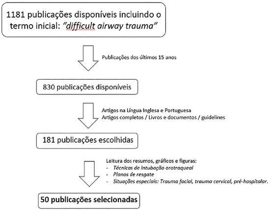 A busca foi realizada nas bases de dados Pubmed, Research Gate, LILACS, utilizando inicialmente o seguinte descritor na língua inglesa: difficult airway trauma, sendo 181 publicações escolhidas inicialmente por se tratar da discussão mais ampla sobre o tema. As mesmas foram avaliadas pelo título e palavras-chaves, seguido pelo resumo, tabelas e figuras, sendo selecionados no final 50 publicações para leitura na íntegra (Figura 1), pois se adequam aos objetivos traçados pelo trabalho, além de trazerem discussões específicas de situações especiais descritas na discussão.