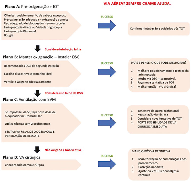 Diante do exposto, sugerimos que a equipe de trauma deve estabelecer planos de abordagem da via aérea, de forma que sempre esteja preparada para possíveis complicações em qualquer etapa do procedimento escolhido/mais adequado para cada cenário na emergência (Figura 2).