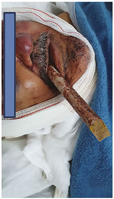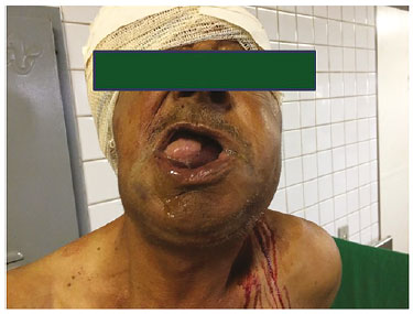 As lesões graves de face em pacientes vítimas de trauma são causas frequentes de atendimento no DE. O manejo de tais lesões, pode ser bastante desafiador (Figura 4). A possibilidade de sangramentos volumosos e a proximidade com outras estruturas nobres (sistema nervoso central, coluna cervical) trazem particularidades ao manejo da via aérea40. Além da possível perda de reflexos de proteção da VA, o que aumenta o risco de aspiração, tais situações vem acompanhadas de redução do nível de consciência por lesões de SNC ou intoxicação por álcool/drogas; a presença de restos de partes moles, dentes quebrados ou outros corpos estranhos fazem parte do cenário de atendimento a esses pacientes críticos. Deve-se ter em mente que os traumas de face proporcionam alta probabilidade da existência de uma VA ameaçada41. O manejo inicial parte da pesquisa de sinais de que sugiram tais ameaças de forma precoce, como: presença de estridores, desvio de traqueia, grande quantidade de vômitos e/ou sangue em cavidade oral. No mais, o método de escolha para obtenção de uma VA segura deve ser individualizado, porém alertamos que os planos de resgate sempre devem estar à disposição de toda equipe no DE. Nessas situações, é fundamental que os profissionais sejam treinados na realização de uma VA cirúrgica, pois esse tipo de lesão traumática, em muitas situações, nos exige tal fato.
