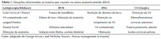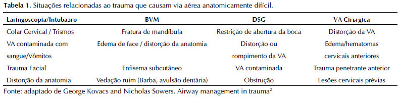 A VAD ocorre em situações que o profissional de saúde se depara com alterações anatômicas ou clínicas que predizem a dificuldade na obtenção da VA definitiva. Quanto à dificuldade do manejo da VA pode-se pensar em 2 categorias: anatomicamente difícil e fisiologicamente difícil. Alterações anatômicas podem interferir em etapas importantes do manejo da VA, como a laringoscopia direta, ventilação com BVM ou DSG, além da prática de via aérea cirúrgica (Tabela 1).5 Em alterações fisiológicas, o examinador enfrenta um grande desafio na otimização global do paciente, principalmente com relação à saturação de oxigênio, choque instalado e/ou oculto, além de desequilíbrios metabólicos, como a acidose metabólica grave. Todos os pacientes vítimas de trauma devem ter fatores anatômicos e fisiológicos considerados, planejados e, idealmente, corrigidos como parte de seu plano no manejo das vias aéreas6.