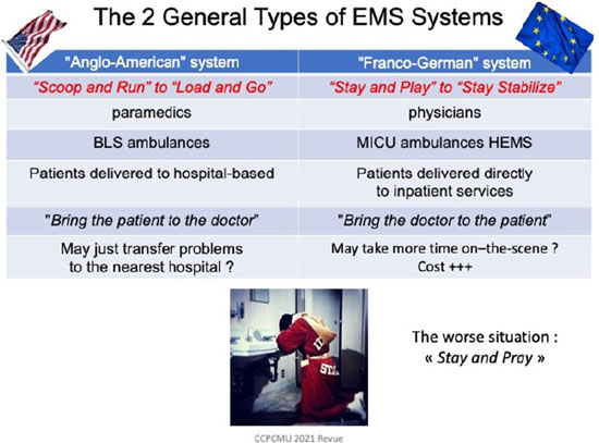 In the absence of reliable studies comparing the 2 systems «scoop and run» (renamed «load and go») and «stay and play» («stay and stabilize»), the analysis of pre-hospital systems in the world seems above all to be organized at the level of the management of appropriate medical or traumatic emergencies.