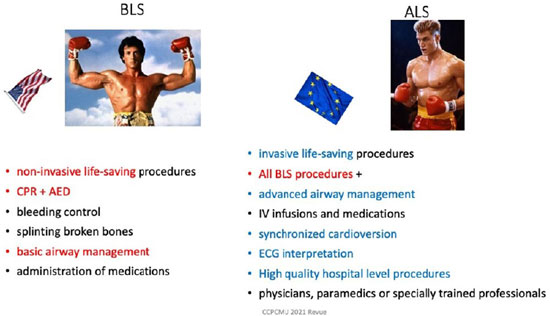 Two major models of emergency care delivery exist today in Europe: the Anglo-American model and the Franco-German model. A majority (63%) of European countries have a pre-hospital EM system (EMS) managed by trained emergency physicians (Figure 7). Various northern European countries use the paramedical system and the pre-hospital EMS is partly managed by doctors (33%) or technicians. Most countries developing new emergency care systems follow the Anglo-American model. In the UK, the turnaround time is reduced from 8 minutes to 20 minutes with Basic Life Support (BLS) sustaining ambulances or Advance Life Support (ALS) ambulances with 7000 paramedics trained (2 years) in the skills of emergency or NHS ambulance service (Figure 8 and 9). In the immediate care plan, some doctors trained in pre-hospital emergency medicine can intervene on site, in helicopter-borne interventions (HEMS) in the UK or Australia. However, the pre-hospital medicalization system may delay the patient’s arrival time at the emergency department.