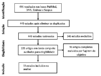 A busca resultou em 496 publicações, sendo 24 da base PubMed, 14 da BVSaúde, 457 da Scopus e 1 da Embase. Desses, 47 eram duplicados; 115 estavam fora do período analisado; 202 eram revisões de literatura, relatos de caso, diretrizes ou comentários; 29 eram estudos com animais, crianças e in vitro e foram excluídos. 103 artigos em texto completo foram examinados e 93 estudos não estavam relacionados com os objetivos deste estudo. Assim, apenas 10 artigos foram incluídos para análise (Imagem 1).