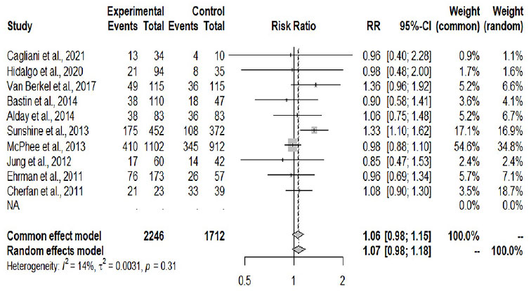 RESULTADOS: 10 artigos foram incluídos para análise. Não houve associação significativa entre mortalidade e administração de dose única de etomidato em pacientes com sepse ou choque séptico (RR, 1.06; IC 95%, 0.97; 1.15; p= 0.14). Houve evidência baixa de heterogeneidade (I2 = 14%). Não observamos viés de publicação nesse banco de dados pela inspeção do gráfico em funil e testes estatísticos (teste de Egger, p-valor = 0.96; teste de Begg, p-valor = 0.96).