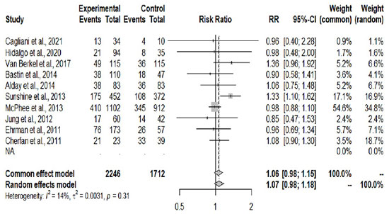 A imagem 2 apresenta os resultados da análise estatística dos dados combinados. Não houve associação significativa entre mortalidade e administração de dose única de etomidato em pacientes com sepse ou choque séptico (RR, 1.06; IC 95%, 0.97; 1.15; p= 0.14). Houve baixa evidência de heterogeneidade (I2 = 14%). O RR foi estatisticamente significativo (RR, 1,33; IC 95%, 1,10-1,62) apenas em um estudo.14 A exclusão adicional de qualquer estudo único não alterou materialmente o RR geral combinado, com uma faixa de 1,01 (IC 95%, 0,92-1,10) a 1,16 (IC 95%, 1,03-1,30).