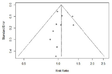 Em relação ao viés de publicação, observou-se uma assimetria na base do funil para o lado de resultados que não mostravam associação entre dose única de etomidato e mortalidade de pacientes sépticos (imagem 4). Os testes estatísticos não evidenciaram viés de publicação (teste de Egger, p-valor = 0.96; teste de Begg, p-valor = 0.96).