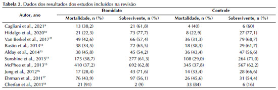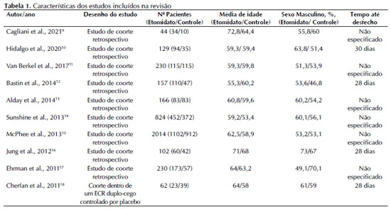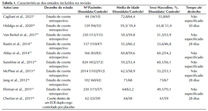 A tabela 1 apresenta as principais características dos estudos incluídos e a tabela 2 os dados do desfecho analisado. Dos estudos incluídos, 9 eram coortes retrospectivas e 1 era um estudo de coorte dentro de um estudo randomizado duplo-cego controlado por placebo avaliando o uso de baixa dose de hidrocortisona em pacientes cirróticos sépticos. A média de idade foi maior no grupo etomidato em 7 dos 10 estudos e o sexo masculino predominou no grupo etomidato em 7 pesquisas incluídas. Em relação a mortalidade, a proporção de mortes no grupo etomidato só foi maior que a do grupo controle em 4 estudos.