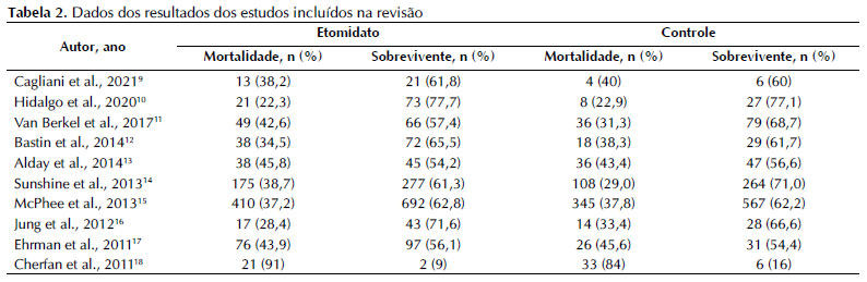 Os resultados deste estudo confrontam uma metanálise realizada em 201219, na qual houve associação de dose única de etomitado com mortalidade. Em seu estudo, Chan e colaboradores19 encontraram RR agrupado de 1,20 (IC 95% 1,02–1,42) e, quando agruparam estudos que mostravam mortalidade em 28 dias, o RR agrupado era de 1,08 (IC 95% 0,95–1,21; p= 0,028). Entretanto, o RR combinado para mortalidade de todos os cinco estudos foi de 1,16 (IC 95% 1,02–1,29; p = 0,276) após a metodologia de preenchimento e corte. Além disso, a metanálise tinha apenas 5 estudos.