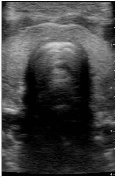 A imagem única da interface ar-mucosa, correspondendo a traqueia, deve ser visualizada para confirmar que não há tubo posicionado no esôfago do paciente. Esse artefato de reverberação posterior da imagem traqueal é também chamado de rabo de cometa, como mostra a Figura 1. Caso haja intubação esofágica, o canal anteriormente fechado (Figura 2), passa a estar aberto com o tubo em seu interior, onde visualizamos dois artefatos de rabo de cometa, com duas interfaces ar-mucosa com sombra posterior, visualizado na posição póstero-lateral a traqueia, como mostra a Figura 3.
