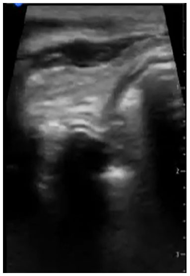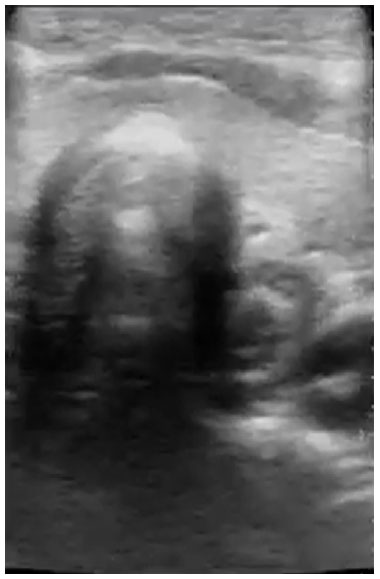 Paciente, 58 anos, da entrada no departamento de emergência com insuficiência respiratória aguda, há 3 dias. À admissão hospitalar paciente encontra-se normotenso, taquicardico com frequencia cardíaca de 108 bpm e uma saturação em máscara de reservatório de 91%, fazendo uso de musculatura acessória. Realizada intubação orotraqueal por sequência rápida de intubação, por meio de laringoscopia direta, tubo nº8.0, sem intercorrências. Checado posicionamento do tubo por meio da ausculta pulmonar, com dúvida quanto a presença de murmúrios ventriculares bilaterais. Logo após a intubação, evoluiu com dessaturação com rápido decréscimo. Decidido avaliar o posicionamento do tubo por meio do ultrassom beira leito com transdutor linear, com achado do dispositivo no interior do esôfago. Logo que identificado, foi retirado o tubo esofágico, reoxigenado com bolsa válvula máscara e posteriormente reintubado com checagem simultânea por meio do ultrassom na região anterior do pescoço, com procedimento realizado com sucesso e tudo localizado no interior da traqueia.