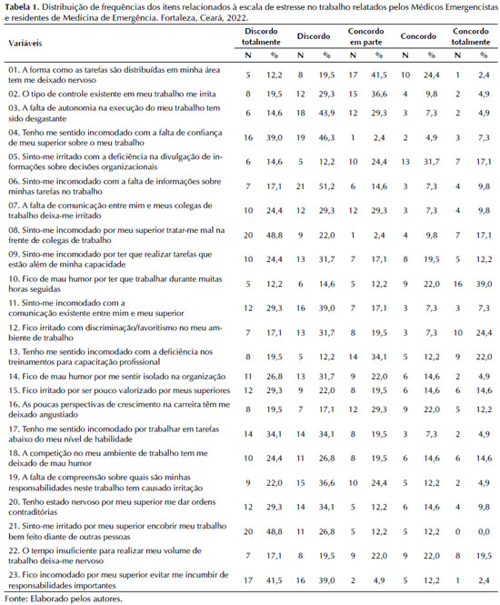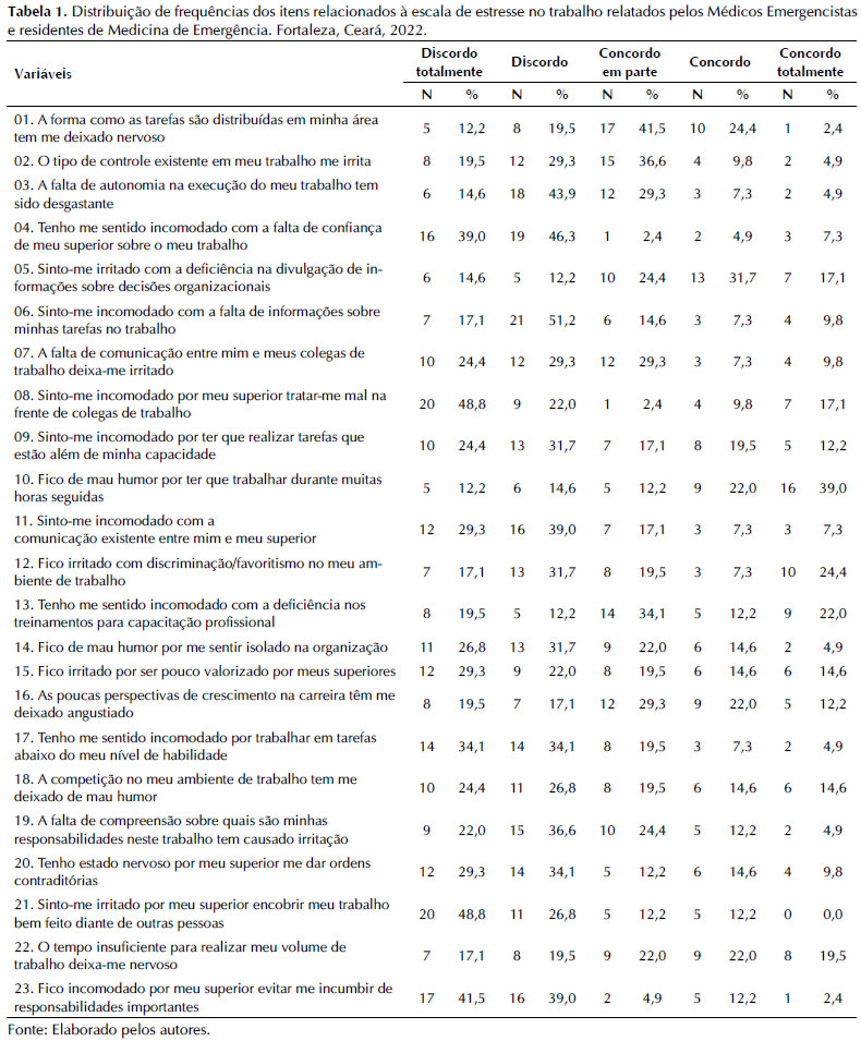 A Tabela 1 apresenta a distribuição de frequências dos itens relacionados à escala de estresse no trabalho.