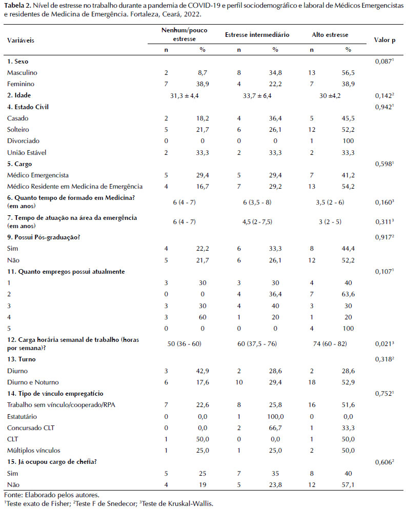 A Tabela 2 evidenciou a associação entre o nível de estresse no trabalho e o perfil sociodemográfico e laboral dos participantes.