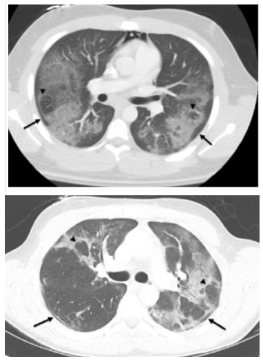 Figure 1. Chest CT of patients with EVALI. In both, symmetrical and bilateral ground-glass opacities with subpleural sparing (arrows) and reverse halo signs are observed bilaterally (arrowheads). In the image on the left, an additional pneumomediastinum (asterisk) is observed[27].