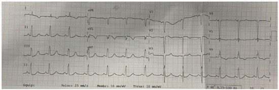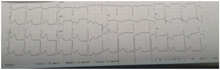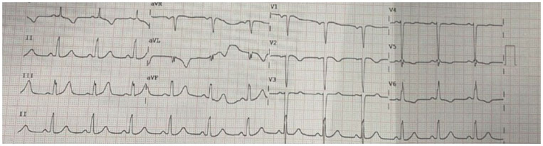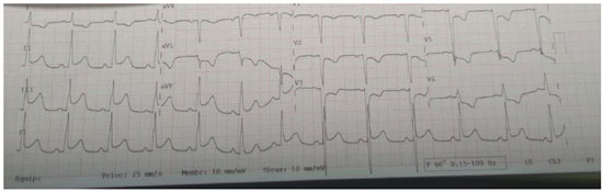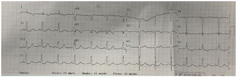 Rodado eletrocardiograma em até 10 min com onda T negativa (concordante com QRS) em avL, onda T negativa em DI, além de distúrbio de condução do ramo esquerdo (padrão em torre visto em V6 e DIII) (foto 1).