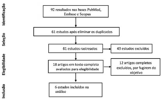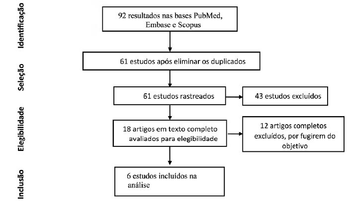 A busca nas bases de dados resultou em 92 publicações, sendo 35 da base PubMed, 25 da Embase e 32 da Scopus. Destas, 31 eram duplicadas, 39 eram revisões de literatura, relatos de caso, diretrizes ou comentários, 4 eram estudos com animais e foram excluídas. 18 artigos em texto completo foram examinados e 12 foram excluidos por não contemplar o objetivo deste estudo. Assim, apenas 6 artigos foram incluídos para análise (Imagem 1).
