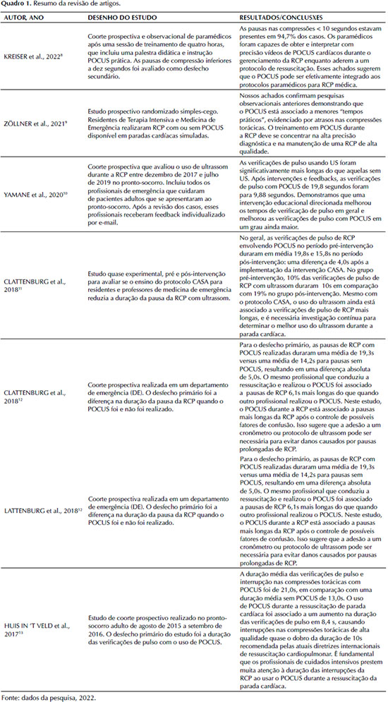 O quadro 1 apresenta o resumo da metodologia e conclusões das pesquisas incluidas neste estudo. A maioria dos estudos eram coorte prospectiva. Em 5 trabalhos houve aumento do tempo de pausas entre as compressões torácicas durante a RCP quando se utilizou o POCUS e em apenas um desses 6 artigos não houve aumento do tempo de pausas.