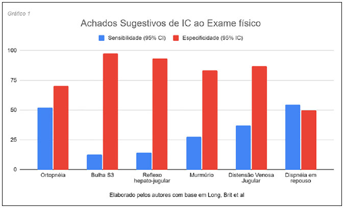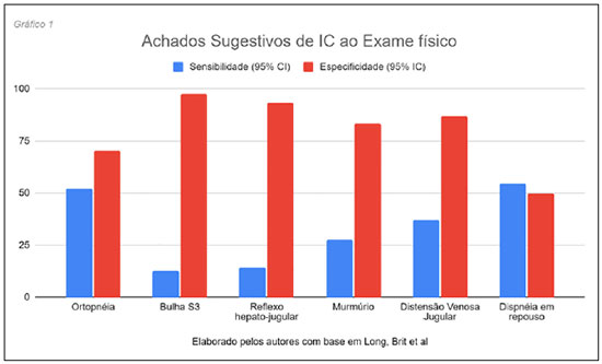 A dispnéia aguda é um sintoma comum nos setores de urgência e emergência e o diagnóstico diferencial entre suas causas cardíacas e não-cardíacas é muito difícil devido à quantidade de patologias e síndromes associadas. (Long, 2019; Piccioni, 2022) O diagnóstico de insuficiência cardíaca (IC) inclui achados ao exame físico, como dispneia em repouso, dispnéia paroxística noturna (DPN), ortopneia e edema, sintomas clássicos do quadro, mas que não são suficientes, somente, para a confirmação do diagnóstico devido sua baixa sensibilidade e especificidade. No gráfico 1 é possível observar a relação entre os principais achados do exame físico e sua acurácia para o diagnóstico de IC. (Feitoza, 2006; Botker, 2018; Muniz, 2018)