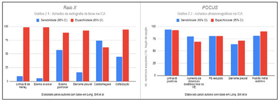 Visto isso, muitos estudos têm procurado avaliar melhor a eficácia do uso do POCUS, como parte da avaliação diagnóstica em quadros de dispnéia por ICA, em contraste com a radiografia, devido seu ganho de espaço na prática clínica por ser mais barato, rápido, prático e apresentar sinais que são mais específicos e sensíveis do que o raio X. No gráfico 2.2, é possível ver essa comparação entre os achados principais em cada exame e seus respectivos resultados.