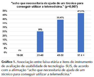 Com relação à idade, os profissionais com mais de 50 anos foram aqueles que referiram precisar mais de ajuda técnica, enquanto sujeitos entre 31 e 40 anos foram os que mais se sentiram confiantes na utilização da telemedicina. A usabilidade da telemedicina foi considerada menos eficiente para os profissionais com idade igual e superior a 51 anos de idade. Estes profissionais tendem a requerer auxílio de uma pessoa com maior expertise para sentirem-se seguros com o uso da telemedicina ou a presença de pessoas mais jovens com disposição para orientá-los. Pessoas com mais idade não são confiantes no uso de tecnologias e geralmente usam menos que os mais jovens, podendo ser este o motivo pelo qual a usabilidade da telemedicina foi considerada inferior nesta faixa etária, como já demonstrado recentemente15.