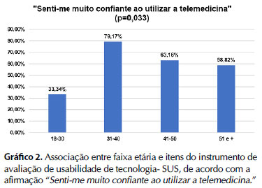 CONCLUSÃO: Profissionais entre 30 a 40 anos apresentaram maior confiança no emprego da telemedicina, porém aqueles com mais de 51 anos avaliaram que precisam de mais assistência para utilização da telemedicina.
