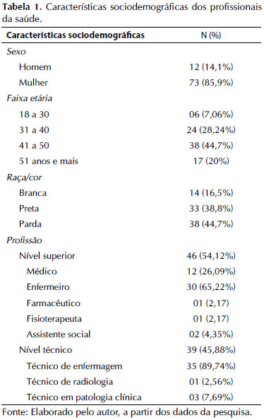 A amostra incluiu 85 profissionais, predominantemente do sexo feminino. No geral, a idade dos participantes teve média de 43 anos (desvio-padrão de ± 8,0 e variou de 24 a 59 anos). A maioria dos sujeitos se autodeclarou parda. Houve maior prevalência de indivíduos de nível superior, no entanto os técnicos em enfermagem foram o grupo com maior número de representantes. A Tabela 1, apresenta as características sociodemográficas dos profissionais da saúde que atuam nas unidades de pronto atendimento fixo.