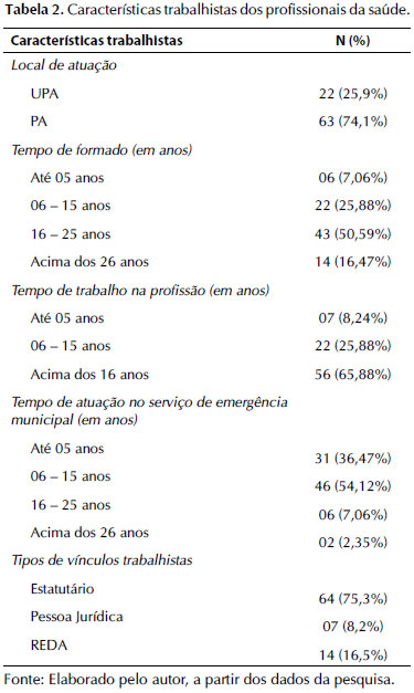 A maioria dos profissionais referiu os PAs comunitários como local de trabalho (74,1%). O tempo médio de formação foi de 18 anos (desvio-padrão de ± 7,0 e com variação de 01 a 38 anos), sendo mais frequente a faixa de 16-25 anos. O tempo de trabalho na profissão teve média de 17 anos (desvio-padrão de ± 7,0 e variou de um a 35 anos), sendo concentrado entre 16-25 anos (50,59%). O tempo de atuação em urgência e emergência foi concentrado entre 6-15 anos, sendo a média de 8 anos (desvio-padrão de 6,0 com variação de 01 a 30 anos). A maior parte dos profissionais tinha vínculo empregatício de estatutário. Na Tabela 2, podem ser vistas as características dos participantes.