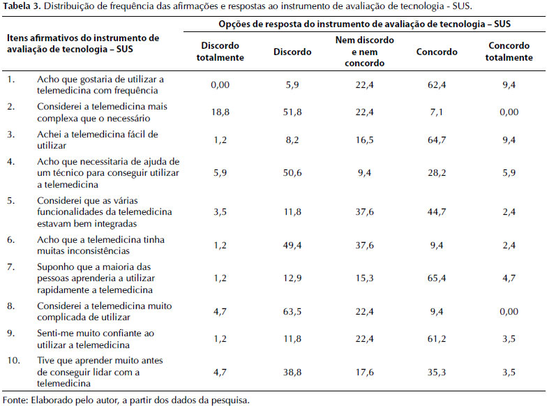 A tabela 3 apresenta o perfil de usabilidade da telemedicina nos serviços de atendimento pré-hospitalar fixo. As afirmativas com mais de 50% de concordância (4 ou 5 na escala Likert) foram: “Acho que gostaria de utilizar a telemedicina com frequência”; “Achei a telemedicina fácil de utilizar”; “Suponho que a maioria das pessoas aprenderia a utilizar rapidamente a telemedicina”; “Senti-me muito confiante ao utilizar a telemedicina”. Já as questões com mais de 50% de discordância (1 ou 2 na escala Likert) foram: “Acho que necessitaria de ajuda de um técnico para conseguir utilizar a telemedicina”; “Considerei a telemedicina muito complicada de utilizar”.
