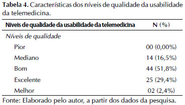 O escore global de usabilidade da telemedicina atingiu média de 67 pontos, com mediana de 70 pontos (desvio padrão de ± 11 e variação de 42,5 a 95 pontos). A tabela 4 mostra que a maior parte dos profissionais da saúde que participaram do estudo consideraram a qualidade da telemedicina como boa (51,8%).