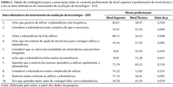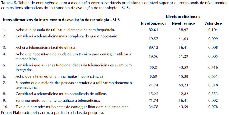 A tabela 5 demonstra que na associação entre profissionais de nível médio versus nível superior foi observado significância estatística para as afirmativas “achei a telemedicina fácil de utilizar” (p = 0,008) e “acho que necessitaria de ajuda de um técnico para conseguir utilizar a telemedicina” (p = 0,005).