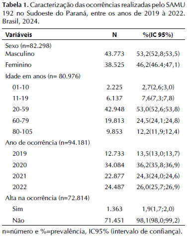 RESULTADO: A análise das ocorrências do SAMU 192 no Sudoeste do Paraná entre 2019 e 2022 revela uma maioria masculina (53,2%) com idade entre 20 e 59 anos (53,0%), sendo mais frequentes em 2020. As principais naturezas de chamado foram clínicas (57,3%) e traumáticas (24,6%), enquanto as transferências foram principalmente clínicas (63,2%) e por Covid-19 (13,6%).
