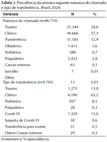 A tabela 2, demonstra uma maior prevalência de natureza do chamado clínica (57,3%) seguido de trauma (24,6%). Da mesma forma o tipo de transferência foi clínico (63,2%) e por Covid-19 (13,6%).