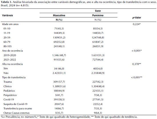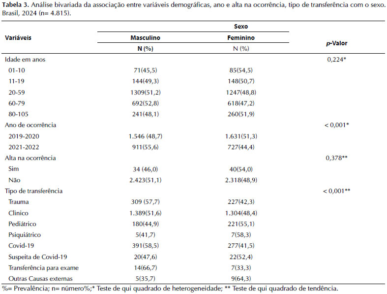 Da mesma forma, observa-se que o sexo feminino apresentou maior prevalência de ocorrência entre os anos de 2019-2020 (p=< 0,001) e, em relação a transferência, para o sexo masculino foi do tipo Covid-19 seguido por trauma (Tabela 3).