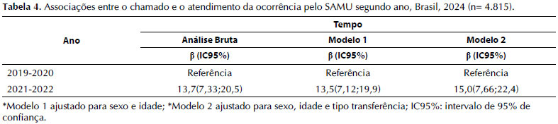 E por fim, a tabela 4 denota que houve um aumento de 15,0 minutos entre o chamado e o atendimento da ocorrência pelo SAMU entre os anos de 2021 e 2022, quando comparado com 2019-2020 na análise totalmente ajustada, sendo esse resultado estatisticamente significativo (IC95% 7,66;22,4).