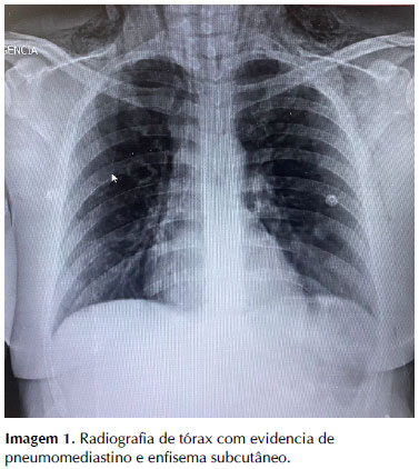 Pneumomediastino, secundário ou espontâneo (Síndrome de Hamman), é definido pela presença de ar no espaço mediastinal evidenciada em radiografia torácica e/ou tomografia computadorizada1. A clínica pode cursar com dor retroesternal (68%), dor e inchaço cervicais, dispneia (44%), disfagia, enfisema subcutâneo e Sinal de Hamman (crepitações no ritmo do ciclo cardíaco, à ausculta)2.