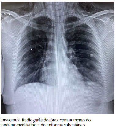 Gasometria arterial da manhã do 2° dia de internação mostrava: pH 7,44; pCO2 29; pO2 94; Lactato 2.6; HCO3 19,7; spO2 98% (com cateter de O2). Avaliação laboratorial não evidenciou achados adicionais, com marcadores dentro dos limites da normalidade. Avaliação radiológica demonstra radiotransparência bem delimitada da silhueta cardíaca e enfisema subcutâneo supraclavicular (no dia da admissão na observação), com leve aumento em radiografia de controle do dia seguinte (Imagem 1 e Imagem 2). Observa-se também, padrão de infiltrado reticular bilateral medial em terços inferiores dos pulmões: