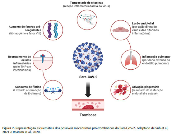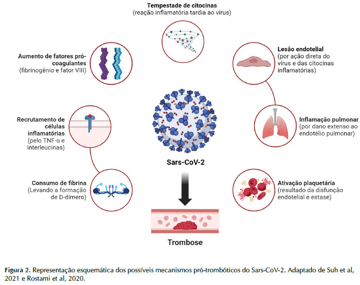 Verificou-se que a própria doença associada a fatores de risco, como aumento de IMC e idade avançada, pode atuar como um estímulo trombótico adicional. Porém, os mecanismos envolvidos nessas alterações ainda não são totalmente conhecidos. Sabe-se, pois, que com o agravamento da doença, poderão existir alterações hemostáticas, como o tempo de protrombina mais longo e altos valores de D-dímero, bem como uma redução na contagem de plaquetas. Esses resultados foram vistos em pacientes que vieram a óbito.