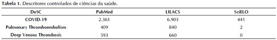A pesquisa ocorreu nas bases de dados Biblioteca Virtual de Saúde (BVS), Public Medline (PUBMED), Scientific Electronic Library Online (SciELO) e Literatura Latino- Americana e do Caribe em Ciências da Saúde (LILACS); e foram utilizados os seguintes descritores: COVID-19, tromboembolia pulmonar e trombose venosa profunda, conforme o vocabulário Descritores Controlados de Ciências da Saúde (DeCS). Foi utilizado o operador booleano “AND” como estratégia de cruzamento desses descritores conforme a seguir: tromboembolismo pulmonar AND COVID-19; trombose venosa profunda AND COVID-19.