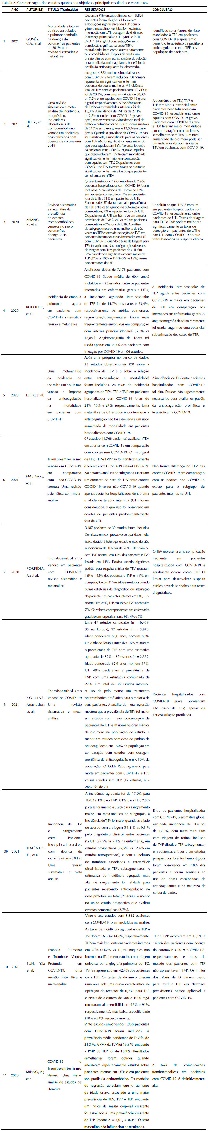 Foi possível verificar, com foco na análise dos trabalhos de metanálises e revisões sistemáticas, a existência da relação entre COVID-19 e eventos trombóticos. Pacientes com quadro grave da condição, especialmente os que estão em leitos de UTI, são mais propensos a desenvolver eventos de hipercoagulabilidade sistêmica, devido à resposta inflamatória exacerbada, e consequentemente aumentar a probabilidade de desfechos como TVP e TEP, ambos condições particulares de TEV.