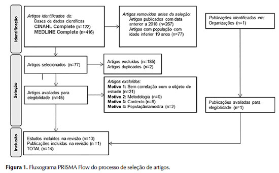 Dos artigos identificados nas bases de dados científicas (122 da CINAHL e 416 na MEDLINE), resultou num total de 538 artigos para procedermos à seleção. Inicialmente, através da aplicação dos critérios de elegibilidade e da análise do título foram selecionados 45 artigos. De seguida, com a observação detalhada do resumo e, em caso de dúvida, à leitura integral do mesmo, obteve-se um total de 14 documentos (13 estudos e 1 publicação da DGS, Portugal) a incluir na revisão da literatura. O processo de seleção de artigos encontra-se descrito no fluxograma PRISMA Flow (Figura 1).