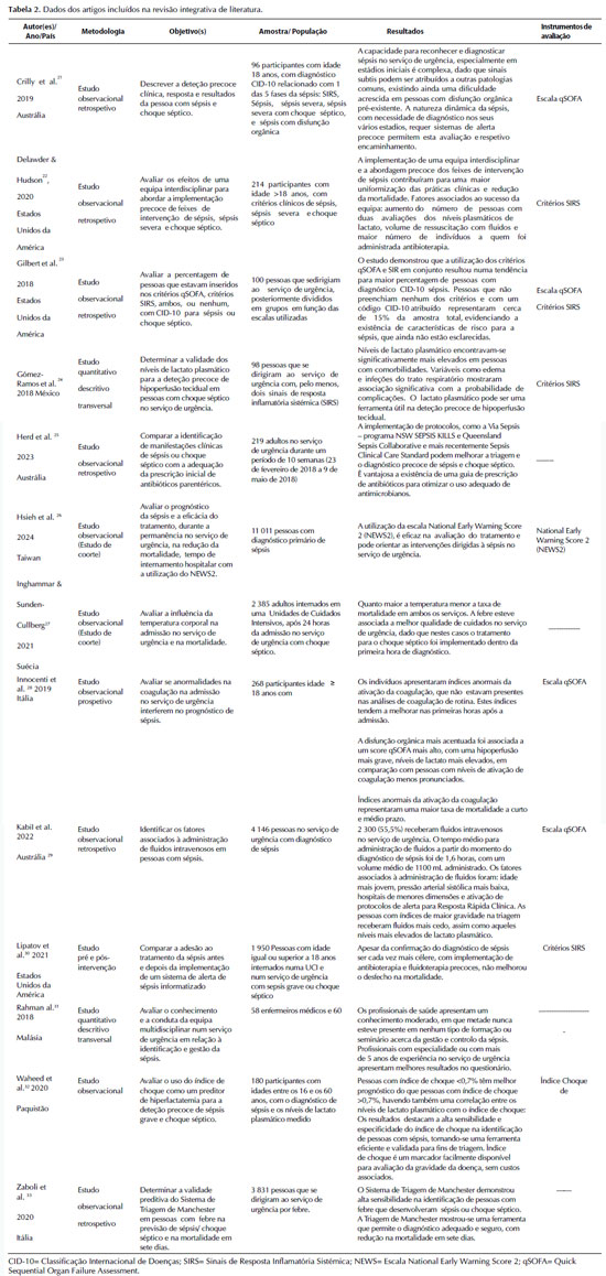 A utilização de escalas de avaliação para a deteção precoce, nomeadamente a Escala Quick Sequential Organ Failure Assessment (qSOFA), permite tipificar o prognóstico da pessoa através de 3 critérios: i) frequência respiratória > 22 ciclos por minuto (cpm); ii) pressão arterial sistólica < 100mmHg; iii) alteração do estado de consciência de acordo com a escala de coma de Glasgow. Um resultado positivo para 2 ou mais destes critérios é correlacionado com um desfecho menos favorável e maior probabilidade da presença de sépsis e choque séptico23,28. Waheed et al.32 aborda o índice de choque, obtido através da divisão do valor de frequência cardíaca pela pressão arterial sistólica, em que valores entre 0,5-0,7 são normais e acima de 0,9-1,0 são indicativos de choque séptico. Nestes três estudos, estas escalas foram consideradas bons preditores de diagnóstico e prognóstico, sendo que pessoas com resultados elevados na escala de qSOFA e de índice de choque apresentaram maior mortalidade. Os autores destacam que a rapidez, a fácil aplicabilidade e o custo mínimo de ambas as tornam ferramentas úteis, para detetar precocemente o choque séptico e escalar a intervenção.