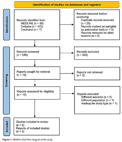The initial search yielded 571 records. After duplicate removal, 25 records were excluded. After screening the titles and abstracts of the remaining 546 studies, 13 full-text articles were assessed for eligibility. Ultimately, 6 studies met the inclusion criteria for the meta-analysis 3,7,9–11,14 and were included in the final analysis (Fig. 1). The pooled analysis included total of over 2,000 participants and used AI models. The mean age of participants was approximately 53 years and all the included studies were retrospective. The most commonly used structure were convolutional neural networks (CNNs) and most of the studies were a mix of emergency trauma and non-trauma cases. The main characteristics of the studies are summarized in Table 1.
