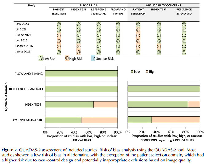 Overall risk of bias of the included studies was low. The first domain and its applicability, regarding patient selection, was significant for multiple studies with potential risk of bias due to case-control design adoption and potentially inappropriate exclusions based on image quality. The remaining domains had the majority or totality of studies categorized as low bias risk (Fig. 2).