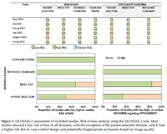 Data from the included studies was extracted. Baseline characteristics such as geographic location, mean age, diagnosis, study design and AI model details were extracted and summarized. Risk of bias assessment was performed independently by two authors. The preferred tool was the Quality Assessment of Diagnostic Accuracy Studies (QUADAS-2). Each of the included studies was analyzed in the seven proposed domains by the authors. Discrepancies were resolved by consensus or third-party adjudication. Given the small number of included studies, publication bias analysis was not performed outside of sensitivity analysis.