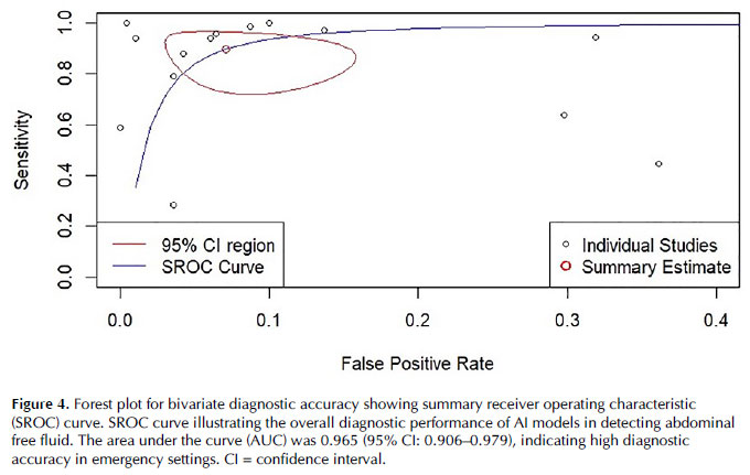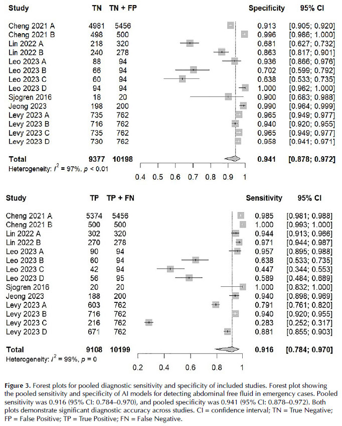 OBJECTIVE: This systematic review and meta-analysis aimed to assess the diagnostic accuracy of artificial intelligence (AI) models in detecting abdominal free fluid via ultrasonography in emergency and critical care settings. Given the increasing demand for rapid and accurate assessment in trauma care, AI-based models could improve diagnostic efficiency, particularly in point-of-care settings.
