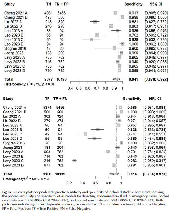 CONCLUSION: AI models demonstrate high diagnostic accuracy in detecting abdominal free fluid via ultrasonography in emergency settings. Despite some variability and heterogeneity, AI has the potential to significantly enhance diagnostic accuracy in trauma and non-trauma care.
